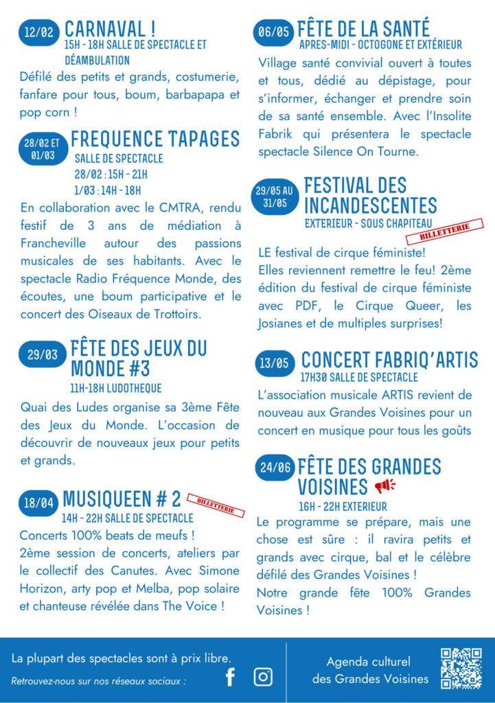 La nouvelle programmation de janvier à juin est arrivée, et elle s’annonce festive, conviviale et pleine de moments à partager. Entre musique, célébrations et rendez-vous incontournables, les Grandes Voisines continuent de vibrer.